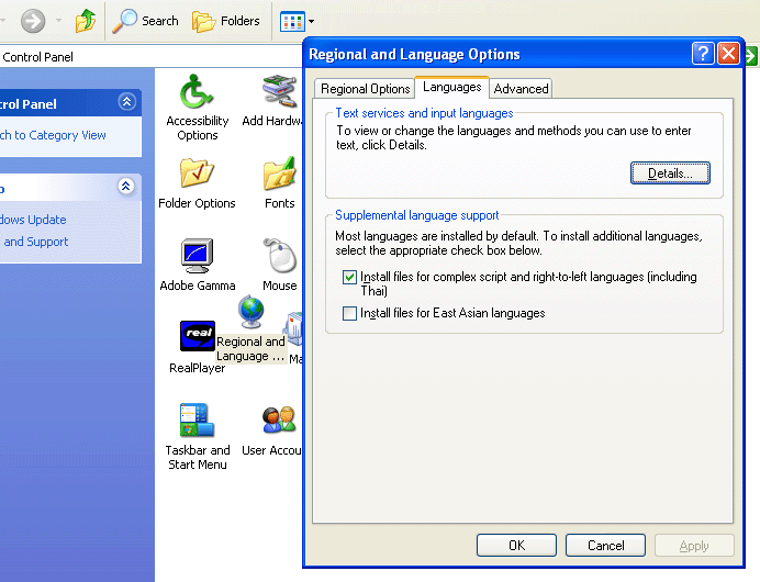 - In the "Supplemental language support" section check the "Install files for complex script and right-to-left languages (including Thai)" check-box.